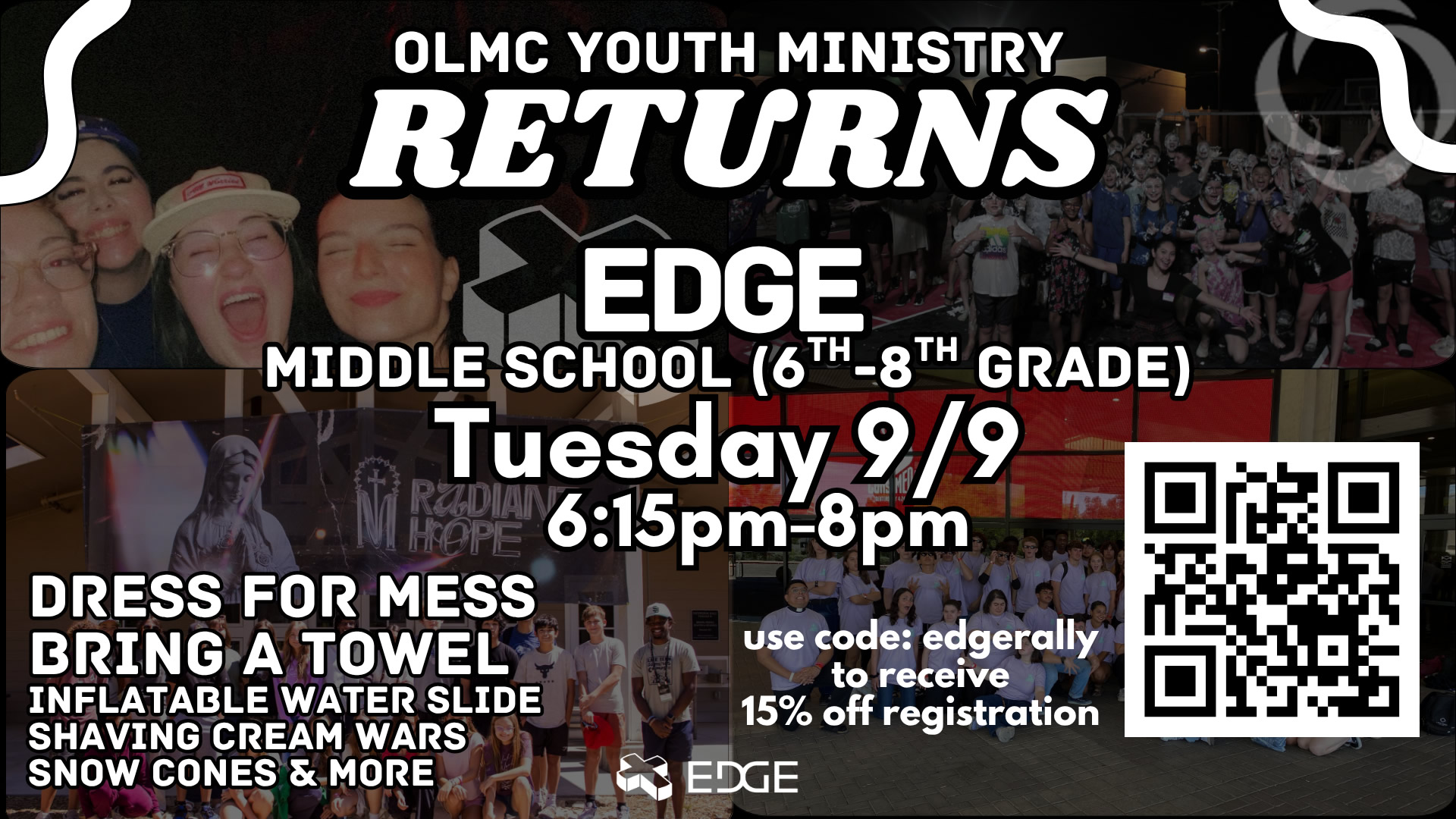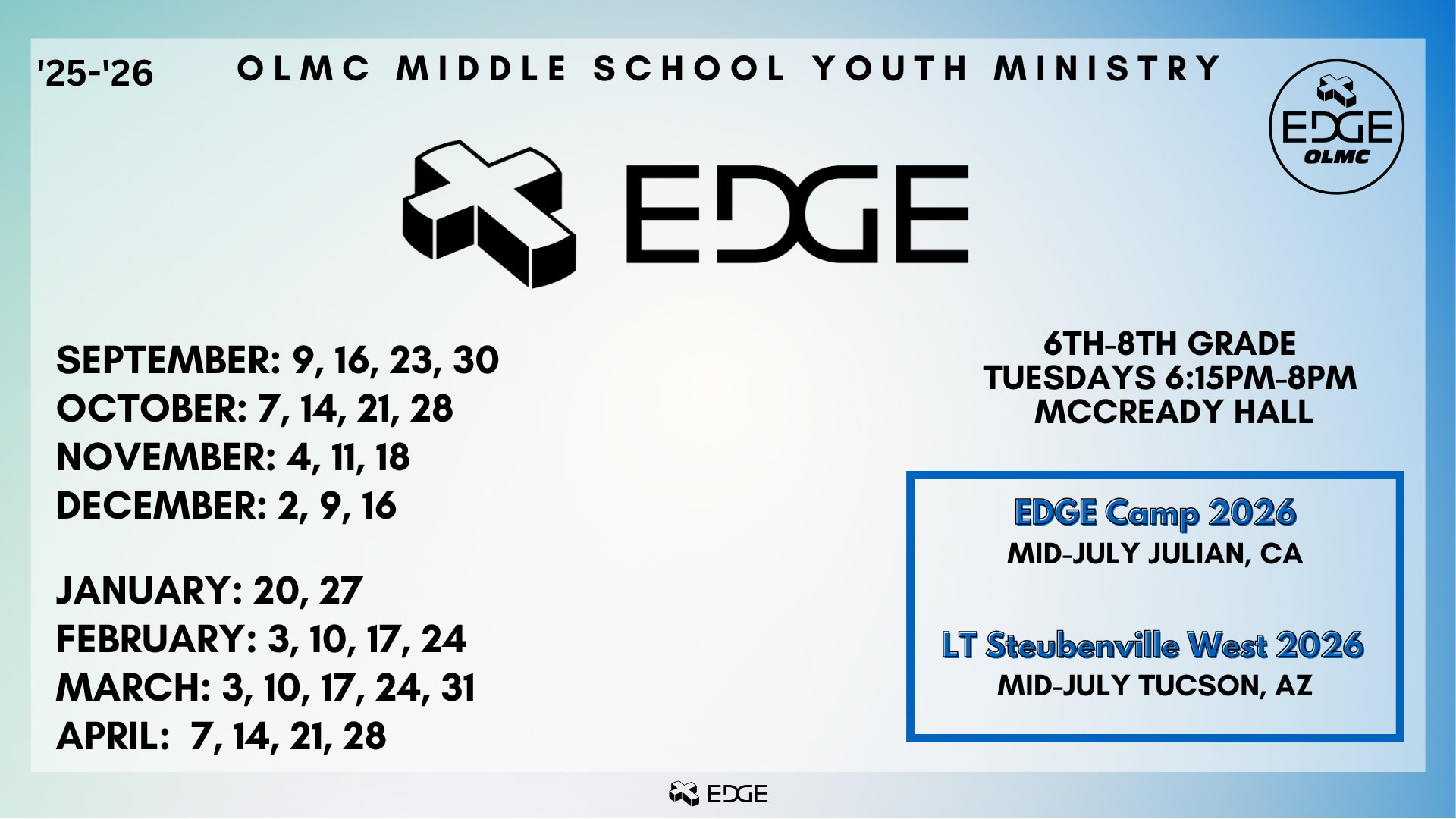 OLMC EDGE is a Catholic Youth Ministry Program. It provides a place for teens to find solid Catholic community, to get answers to their questions about faith, and, most importantly, to experience Jesus in a profound and personal way.